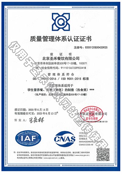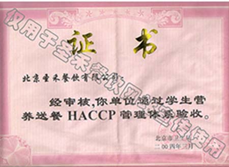 学生营养送餐HACCP管理体系验收证书